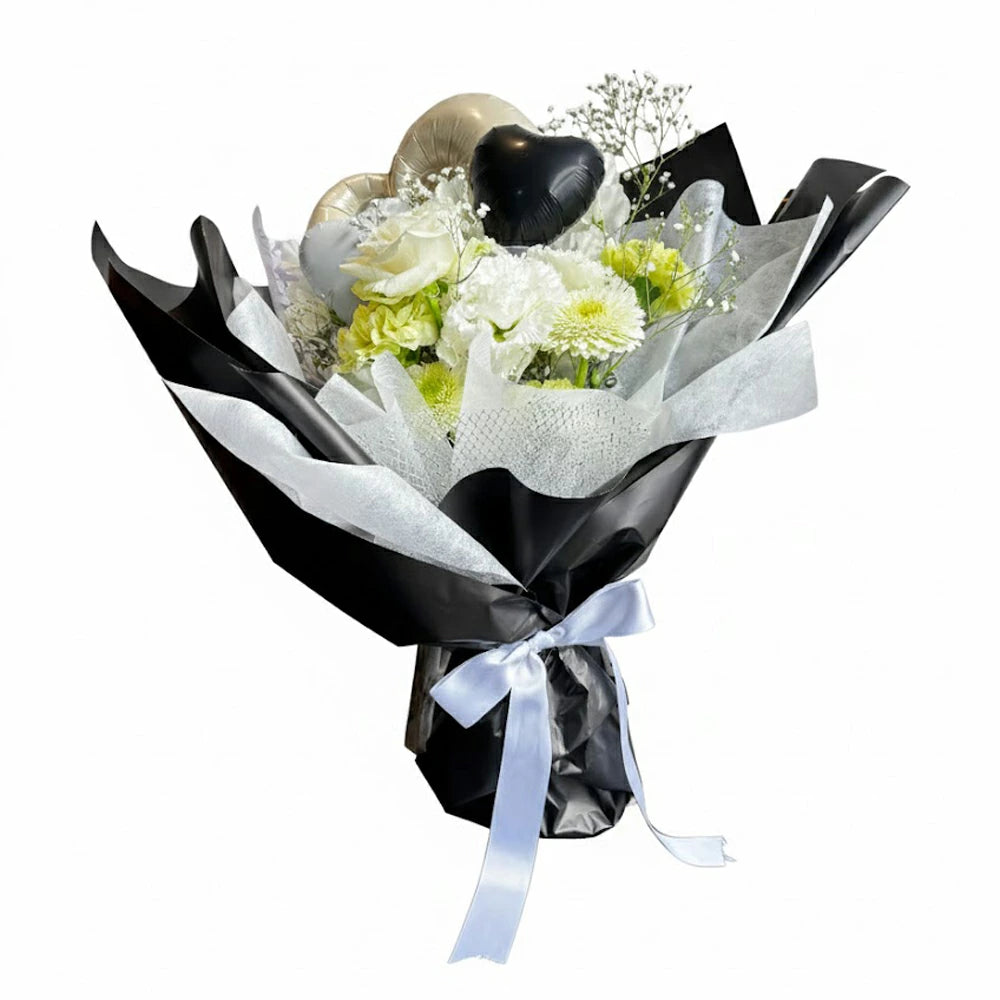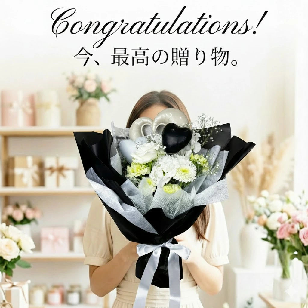 ブラック&ホワイトコントラストが美しいバルーンブーケ、特別な一日をより印象的に、瞬間を華やかに彩ります。写真映えも抜群のお祝いにぴったり贈り物です